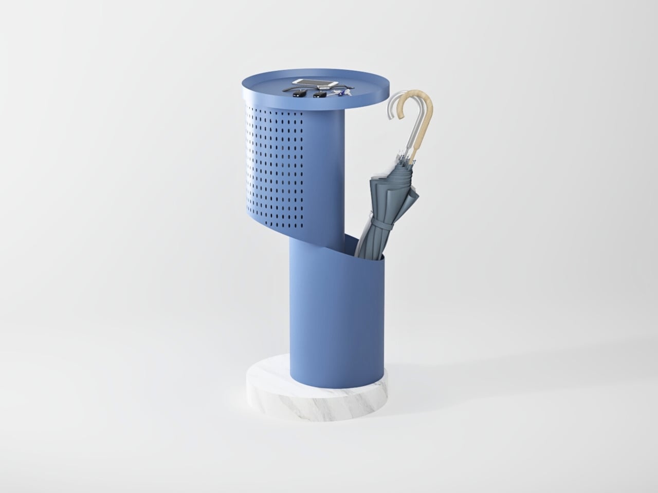 The body is imagined in lightweight aluminum, which keeps it easy to move while resisting rust and corrosion from wet umbrellas. It sits on a heavier stone base that keeps it stable when loaded with multiple umbrellas and everyday items. The concept uses warm, modern colors like terracotta, mustard, and muted blue, so it reads as a small piece of furniture rather than a purely utilitarian object and can live comfortably in a hallway, living room corner, or office lobby.
