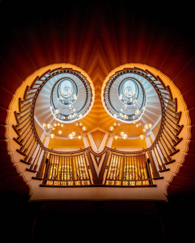 Hengstler describes his photographic style through three core pillars: “Light, Structure, and Symmetry”. Using a Sony A7 camera, he frequently shoots from low angles (“look up” photography) to highlight the mesmerizing, almost abstract patterns of modern glass facades, spiral staircases, and concrete brutalism. His compositions often feature a stark, minimalist aesthetic, using a solitary human subject against massive architectural backdrops to emphasize scale and the feeling of being “all alone in the big city”.