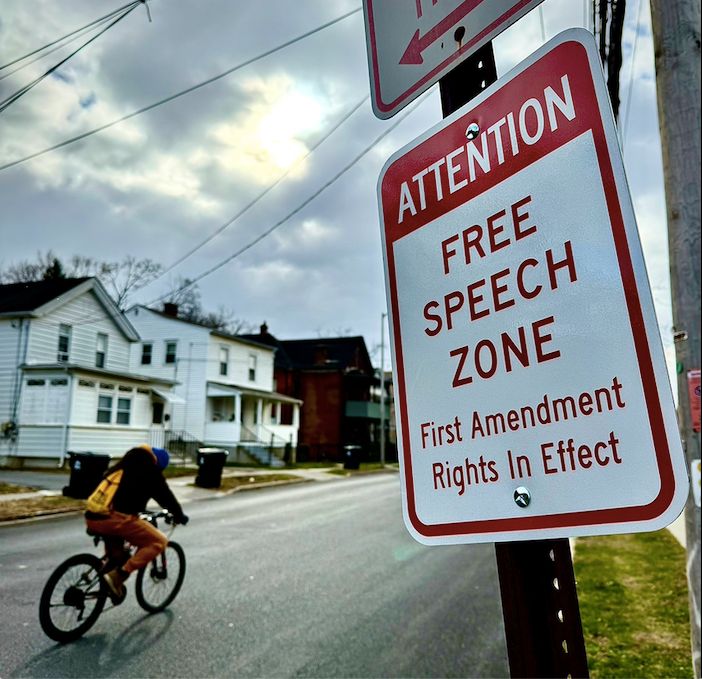 “We keep finding these signs declaring ‘Free Speech Zones’—they’re all over the place, we’ve clocked them from San Fran to Saugerties. Friends kept asking, ‘what’s up with that?’ Well, after a little digging, we found out. The signs are not placed by officialdom, they’re a citizen action. They tip-toe into our landscape, co-opting the graphic language of the regulatory state and hide in plain site. Hide? Yes, but when found they scream out (even if the scream is a stage whisper). It’s satisfyingly subversive, sneaky even. The signs are manufactured to the standards of government codes using high-density aluminum, reflective paint and are installed with ‘tamper-proof’ hardware. (Meaning once up, they’re damn hard to remove.) It’s no secret that the basic tenets of ye olde American Constitution are being battered and tested. This isn’t a ‘maybe’ or an opinion, it’s a fact. As the F.A.C.T. (the First Amendment Culture Team) has stated: ‘Freedom of Speech is the foundational principal in the First Amendment; the entire nation is a free-speech zone. When federal policies push to ban books from public libraries, fire professors, censor museum curators and delete scientific data, a fight for free speech in all forms is essential.’