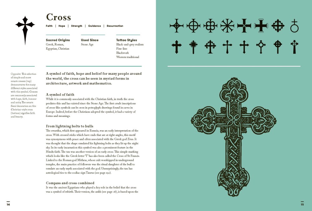 The taxonomy Davies presents is an essential directory for designers, whether or not they have tattoos or are planning on branding their bodies with them. For example, the section on the “Cross” reveals its various origins (Greek, Roman, Egyptian, Christian) and the numerous adopted styles that define it with alternative meanings, including faith, hope, strength, guidance and resurrection. When using any of these empowering forms, it is important that designers understand the nuanced distinctions between them. The reader will assume they know what certain forms represent, only to find that something as menacing as the Eye of Providence is actually more divine than it is satanic.