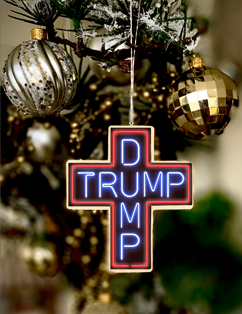 “And when I think back on the ‘Jesus Saves’ cross-shaped neon sign on the facade of a storefront church in my old Bed-Stuy neighborhood, I get inspired to make a vulgar Christmas ornament.” He is planning to turn the one above into an air freshener for your car (by adding a drop of Peach oil) once the holiday is over.