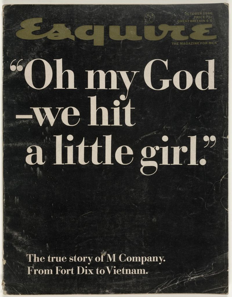 Most of you were not even born yet. In October of 1965, John Sack, an associate producer at CBS, pitched a story about following a U.S. Army company from basic training through their first mission in Vietnam. The story did not fly. Instead, he sold the idea to Harold Hayes, Esquire’s editor, who agreed to have Sack embed with “M” company, which started basic training in Fort Dix, NJ. The resulting 33,000-word story captured the tedium of military life and the brutalities of close combat. It also produced an Esquire cover deigned by George Lois that was shocking and memorable. “OH MY GOD—WE HIT A LITTLE GIRL”—it said in extra-large white Bodoni type against a black backdrop. It was a recollection of a horrified soldier in the field.