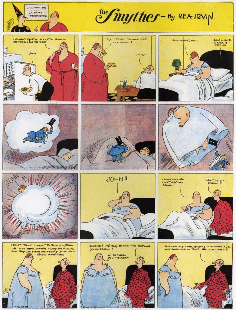 Rea Irvin (1881–1972) is barely remembered for his trove of comic acuity. He was art editor, illustrator and cartoonist for Life in its original incarnation as a humor magazine. More importantly, Irvin was The New Yorker’s first art editor and creator of the magazine’s distinctive typeface called Irvin (still in use today), as well as its mascot, the butterfly enthusiast and dandy Eustace Tilly. In 1930, he turned his pen to newspaper comics with The Smythes.