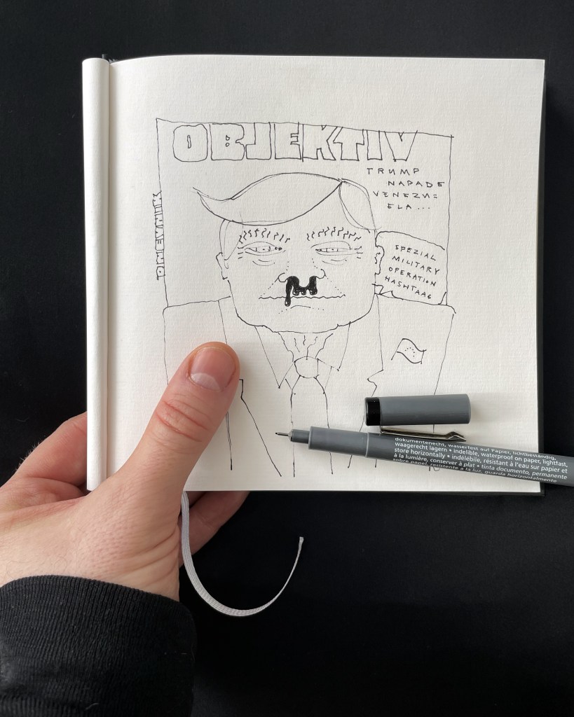 He continues: “The U.S. attack on Venezuela, together with Putin’s invasion of Ukraine, served as a reminder that colonialism is not a relic of the past. Trump revived the imperial foundations of the American-European political tradition, even bypassing Congress in an autocratic manner. In this context, the role of the designer—or visual commentator—is to convey the central theme of the newspaper supplement by harnessing the key strength of visual communication: speed. Visual language can, after all, communicate a thousand times faster than the written word.”