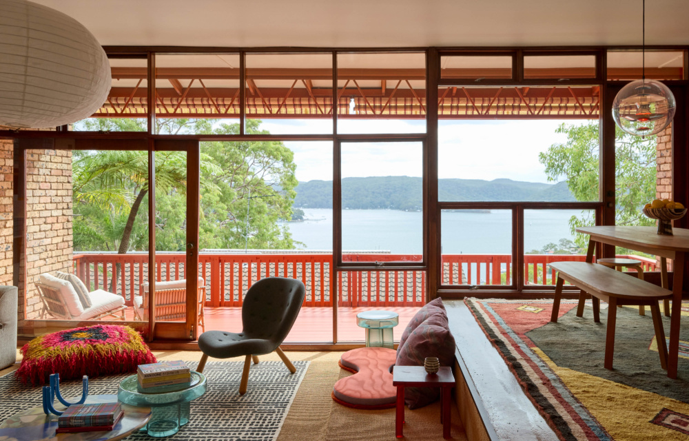 In a DIY renovation (designed by Nasim, and built by Jan), the couple have leant into the 1960s home’s unique qualities, adding bold red exterior trims, restoring the cedar wall panelling, and exposing the concrete floor — all before that incredible Pittwater view.