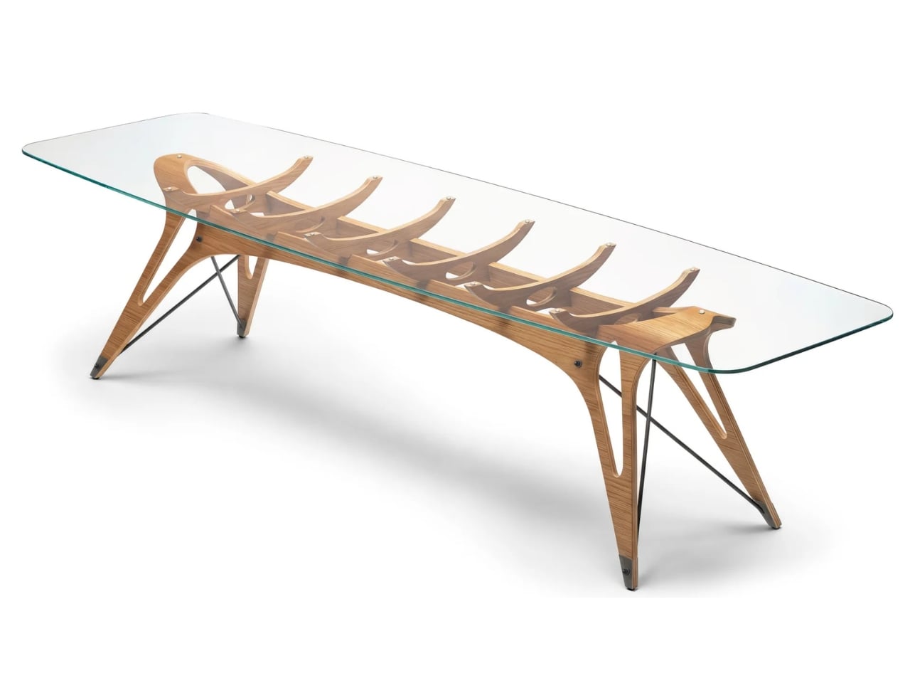 That’s precisely what makes the Vertebra table so arresting. The name isn’t decorative. Mollino perceived furniture not as mere decoration, but as an extension of the body in motion, and the Vertebra’s sinuous, almost skeletal structure makes that philosophy literal. Its base is formed from a single continuous sheet of plywood that curves and flexes in ways that feel less like woodworking and more like anatomy. Look at it long enough and you start to see ribs, joints, a spine caught in mid-motion. It’s the kind of design that makes you forget you’re looking at a table.