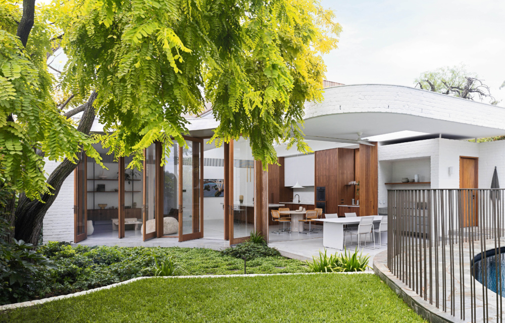 Curved walls made from white bricks, steel forms, and blackbutt-framed windows allow the living and dining space to embrace the leafy tree, establishing a quiet dialogue between architecture and nature.