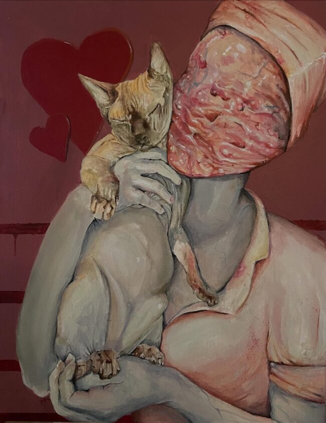 Angstadt’s portfolio is a masterful blend of the macabre and the adorable, working across both traditional and digital mediums. His art frequently features “creepily twisted cartoon characters” and grotesque, horror-inspired figures—such as devils, demons, and ghouls—interacting with cute, everyday subjects. A prominent recurring theme in his work is the “Everybody loves kitty cats” collection, where he merges his passion for horror with his love of felines, painting terrifying monsters gently holding or seeking comfort from fluffy kittens. His unique visual language juxtaposes nightmare fuel with unexpected moments of tenderness, showcasing an absurd but endearing sense of humor.