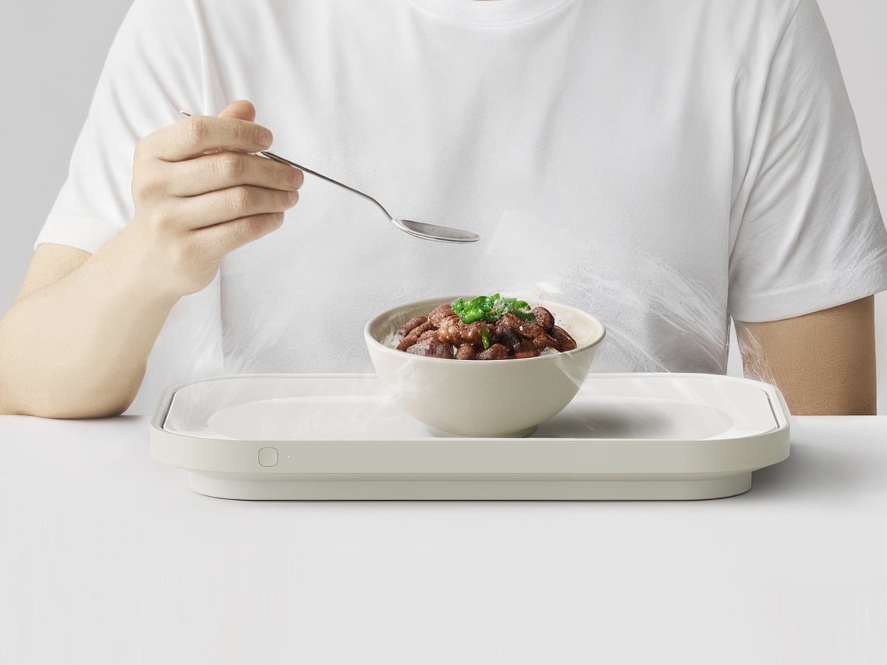 Visually, Notrace:Null makes almost no noise about what it does. The design is quiet and off-white, with a flat surface that opens to reveal an internal filter system underneath. A small button sits flush against the side, the only visible sign that this tray does anything beyond hold a bowl of ramen. The fine venting grid along the underside is equally understated. That restraint feels deliberate, and it is the right call. The best-designed things tend to look like they were always supposed to exist, and Notrace:Null has that quality.