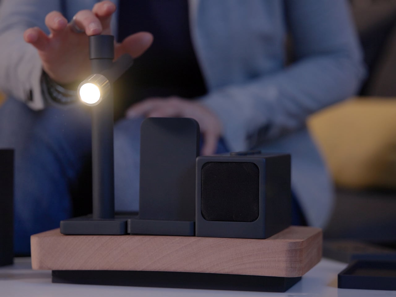 The Light Tower module gives you an adjustable lamp with touch control for brightness and app control for scenes, and that versatility matters in different rooms. On a desk it behaves like a focused task light. Next to the bed you can set it to warm color temperatures and low brightness for late-night reading without frying your circadian rhythm. In the kitchen it can act as an accent light while the e-paper screen counts down the last three minutes on your eggs and the speaker reads out a podcast. Modulo also includes purely physical modules like pen holders and “Pocket Emptier” trays, which make as much sense by the front door for keys and wallets as they do on a workspace. Everything mounts on the same grid, so your catch-all area, your alarm station, and your cooking corner share the same visual language instead of looking like three unrelated tech piles.