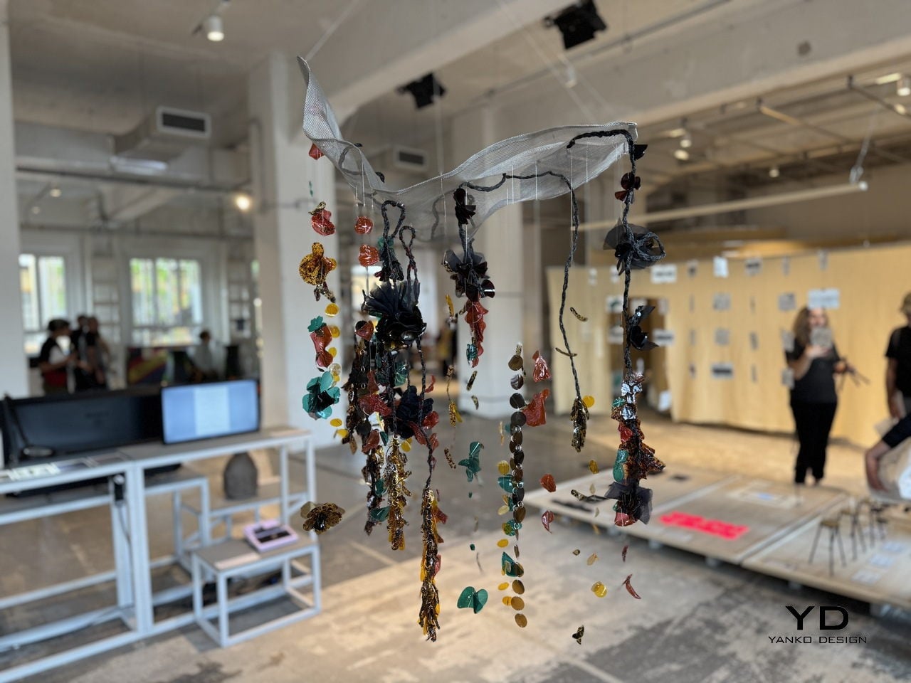 The visual result doesn’t look like a sustainability project at all. The sequins and embellishment pieces come out in deep blacks, jewel-like teals, warm ambers, rich reds, and tortoiseshell-patterned fragments that carry a high-shine finish. Strung onto braided cords and translucent threads for the Milan installation, they hung in dense cascading curtains that looked more like haute couture jewelry than anything born from industrial sludge.
