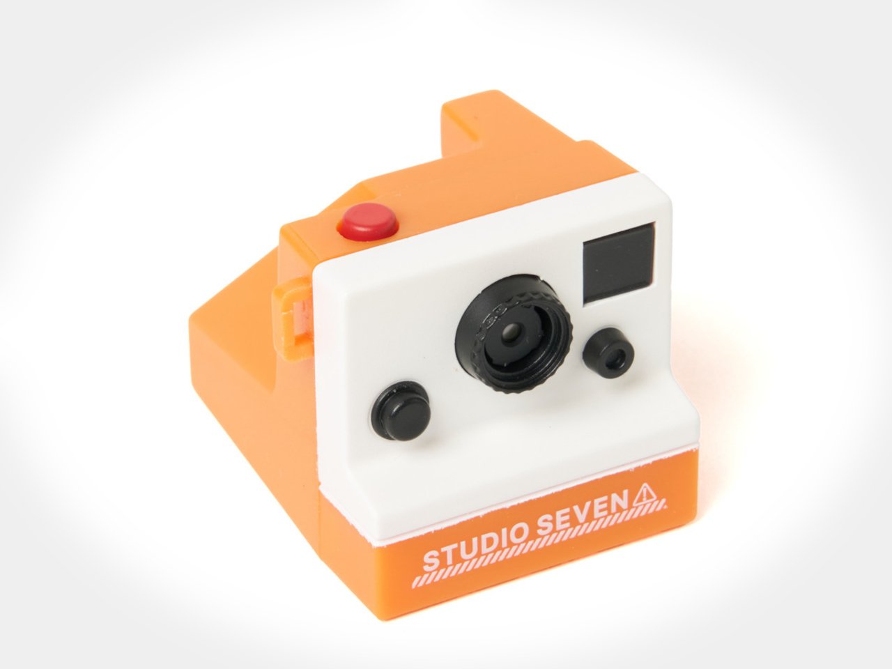 The camera itself is impossible to miss. A bold orange-and-white design dominates the look, with Studio Seven branding across the front and a red shutter button perched on top. The front features a large faux lens, a small viewfinder window, and two black buttons that handle power and capture functions. The whole thing weighs just 15 grams and fits easily in your palm or pocket.