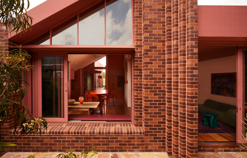 In keeping with the era of the home, the extension is a seamless continuation of warm red brick from the client’s grandfather’s brick factory — the perfect precursor to the bold hues within.