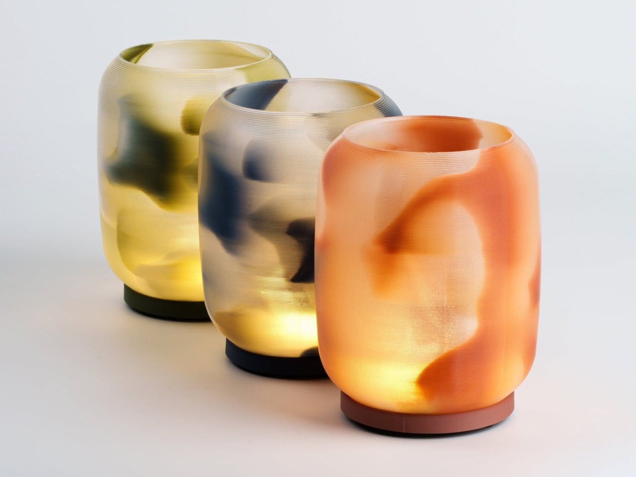 The printer deposits coloured filament at varying depths inside the thick wall of the shade, sandwiching it between inner and outer layers of the translucent base material. This is a level of algorithmic control that feels like a form of digital craft, placing colour with volumetric precision. When you see the lamp unlit, the colours appear soft and suspended. Turning the internal LED on then completely inverts the experience, as the pigmented patterns become dark, dramatic silhouettes against a warm, glowing background. This gives the object a compelling dual personality, making it an entirely different piece depending on whether it is active or at rest.