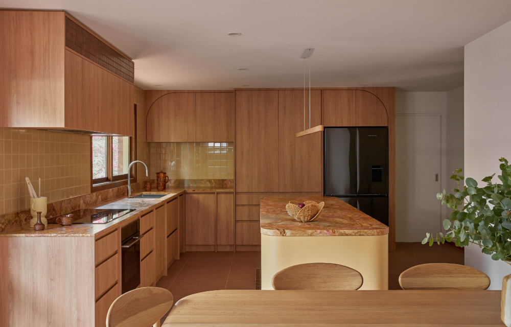Covered in a combination of rich browns, creams, and gold veins, this natural stone set the tone for the rest of the materials; the dark terracotta floor tiles; the honey-coloured laminate; and Polytec Tasmanian oak joinery.