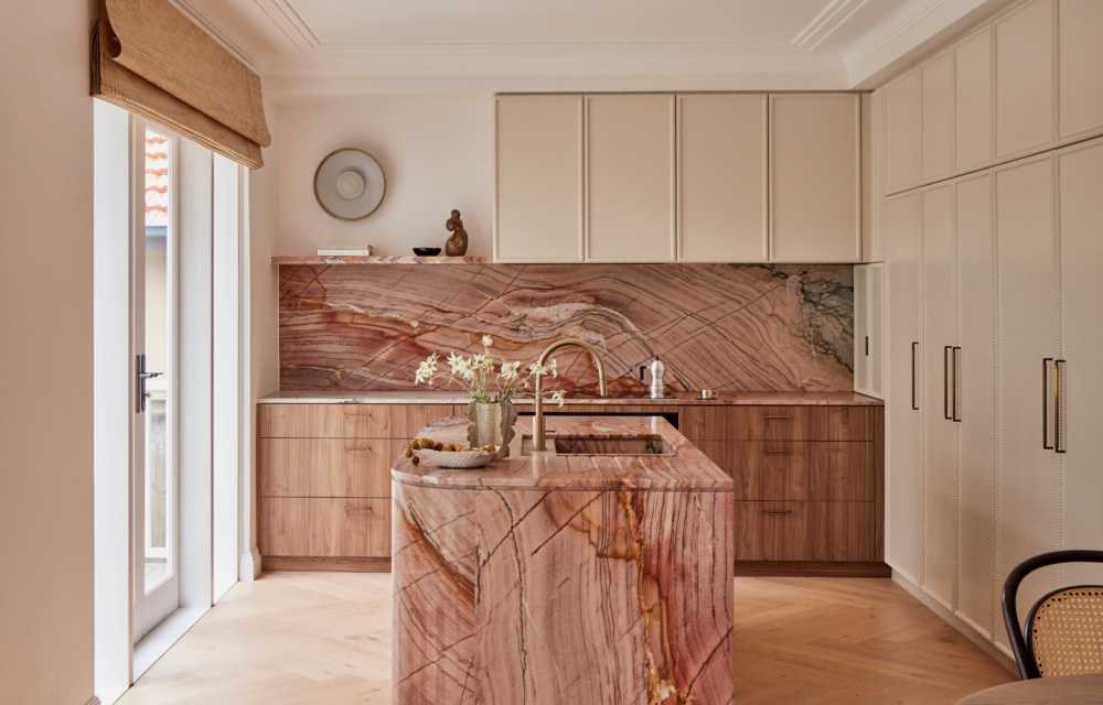 The real hero of the kitchen is now the spectacular quartzite stone island benchtop and splashback, which introduced dusty pinks, clays, and terracotta hues to the contrasting off-white and timber joinery.