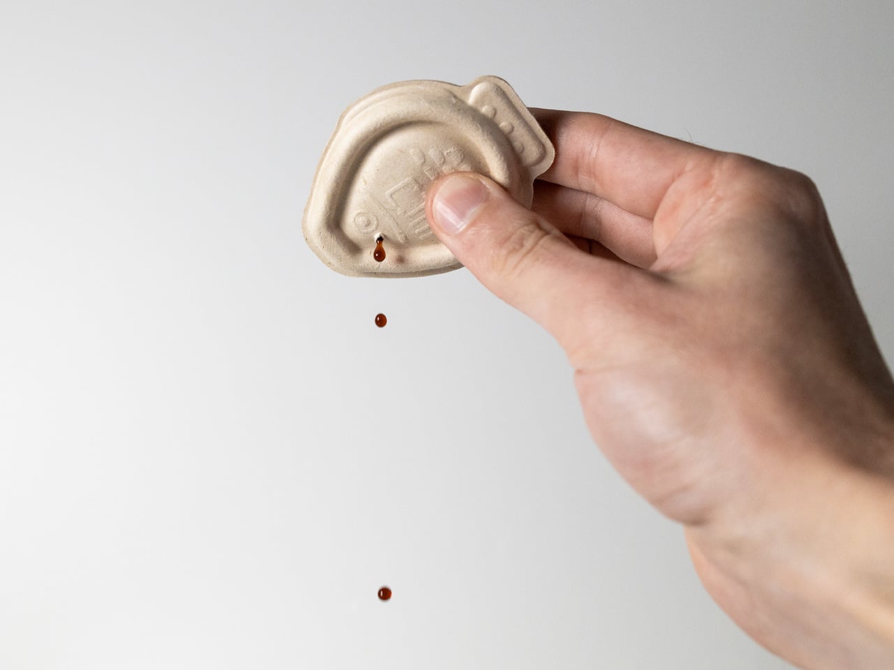 What I love about this story is how Heliograf used knowledge from their existing lamp packaging to crack this problem. Sometimes the best solutions come from your own backyard—literally, in this case, since their lamps already use plastic-free packaging. The droppers hold soy sauce safely for 48 hours and won’t leak all over your takeaway bag.