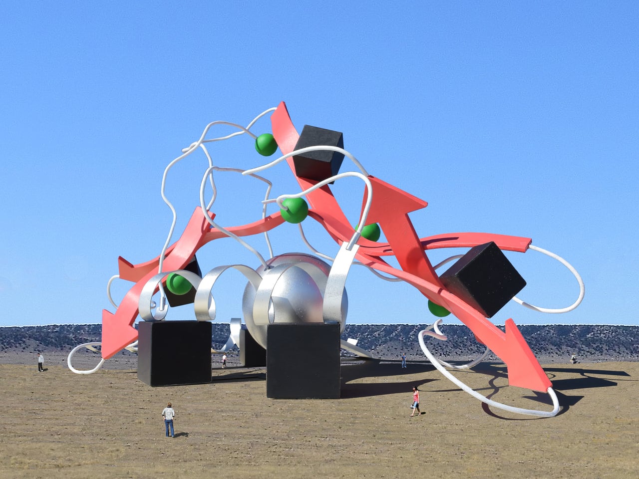 The three black cubes house research spaces, and the large silver sphere forms the exhibition hall, but they sit entangled in bright red arrows, white coils, green spheres, and smaller cubes. The functional rooms are inside these solids while symbolic elements wrap around and pierce them, so the working building is literally knotted up in its own subject matter. You would approach across an open landscape and see a giant folded molecule rising from the ground.