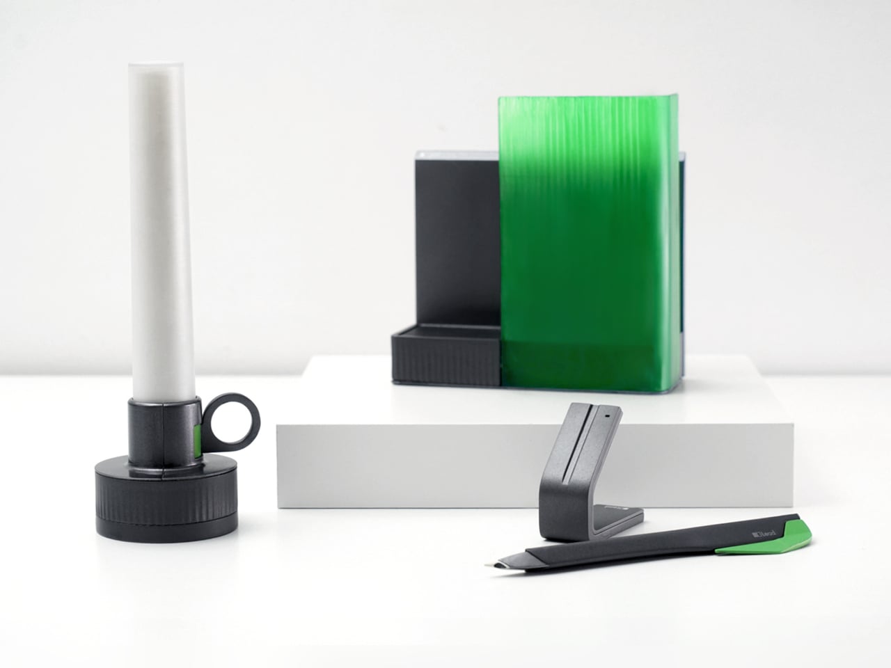 All three objects share dark bases and a calm, translucent green for the parts that move or light up, so they feel like a family without shouting for attention. The interactions are borrowed from analog reading rituals, taking a book off a shelf, lighting a candle, picking up a pen, but layered with just enough technology to guide habit without dragging you back to a screen.