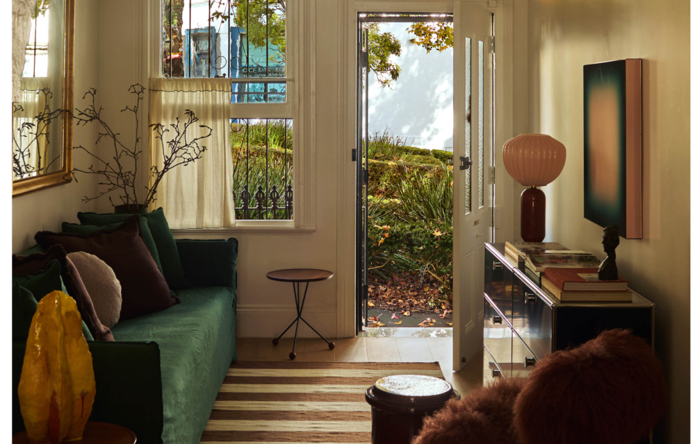 Mid-century green perforated wall light from 1stDibs. Artwork by John Smith. Side table from 506070. Ceramic sculpture by Bridie Gillman. Cushions from Jardan. Vintage olive striped kilim rug.