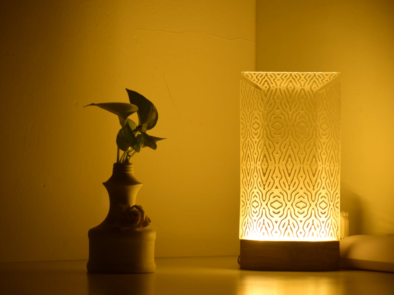 The physical form carries that logic through. The shade is a tall, slim panel mounted on a dark rectangular base that reads as wood. Unlit, the lamp is restrained and cool, with the etched lattice surface present but not clamoring for attention. Lit, the object shifts register entirely. Warm amber pushes through the pattern, and the base-to-shade contrast, dark below and luminous above, becomes the lamp’s defining visual move.