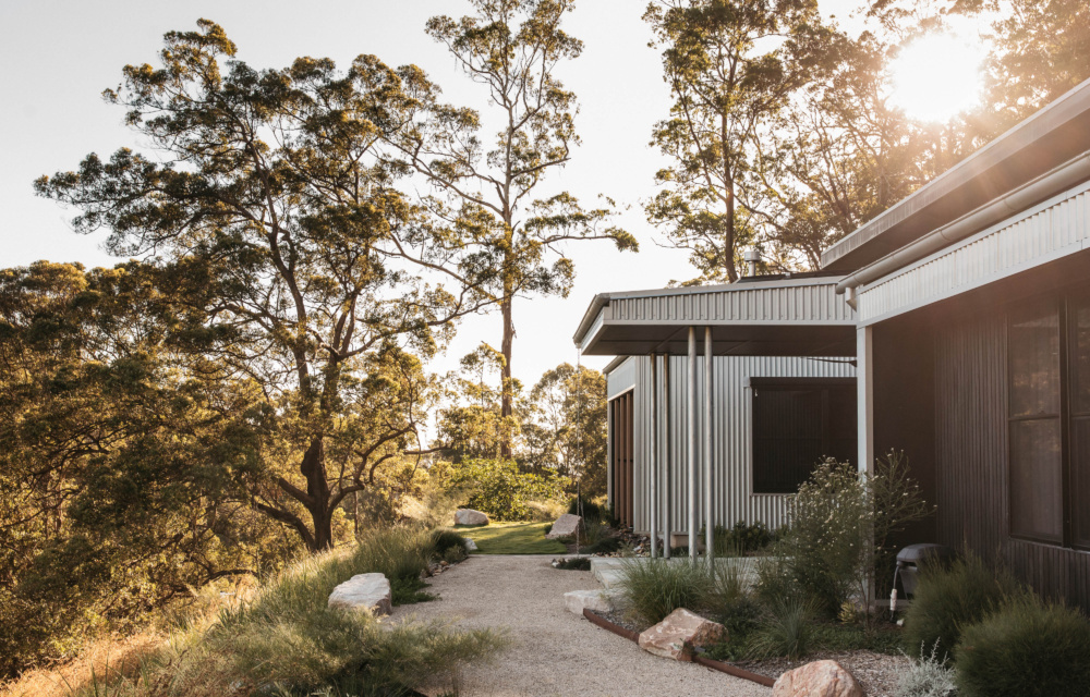 The main exterior material is Zincalume, selected for its heat reflectivity, bushfire resilience, and minimal upkeep.