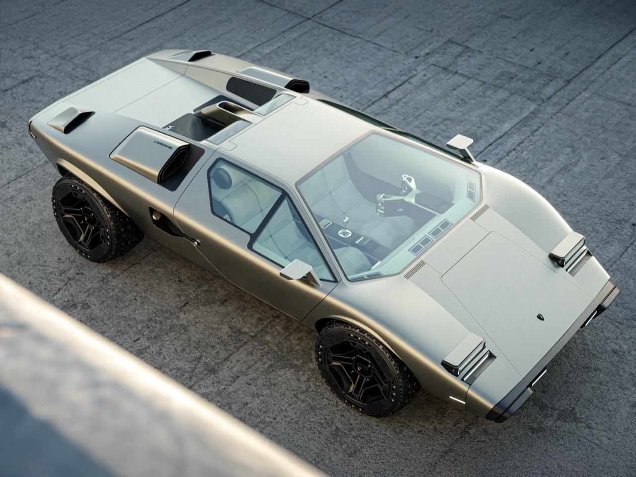 The cooling solutions on display are a fantastic nod to the Countach’s history. The prominent NACA ducts behind the doors are a direct tribute, but the roof scoop is the real masterstroke. It immediately brings to mind the original LP400 “Periscopio” models, which had a small periscope-style trench in the roof for rear visibility. Here, it has been repurposed into a functional air intake, feeding the mid-mounted engine with clean air above the dust line. It is a clever, historically aware detail that shows a deep appreciation for the source material, blending a quirky design feature from the past with a genuine performance requirement for an off-road vehicle. The entire upper deck becomes a study in functional aerodynamics wrapped in that signature angular aesthetic.