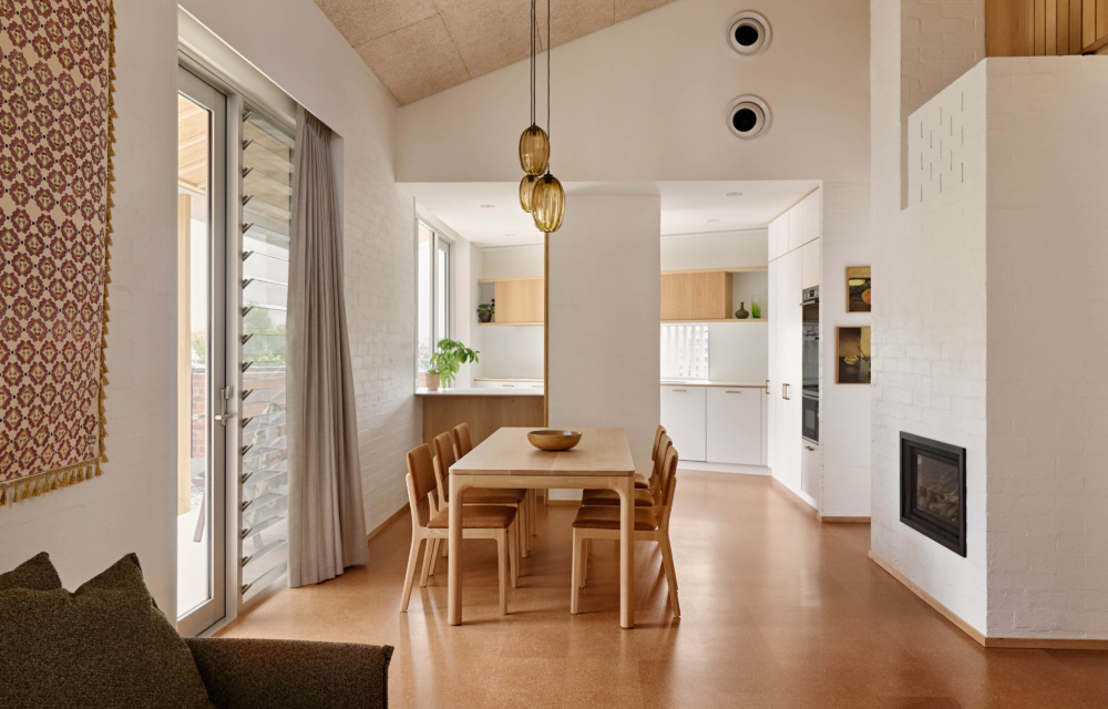 Cork floors, bagged white brickwork, cathedral ceilings and timber detailing provide a nostalgic warmth. There’s a simple charm to each space, adorned with ample built-in bookshelves and cosy corners for reading or quiet retreat.