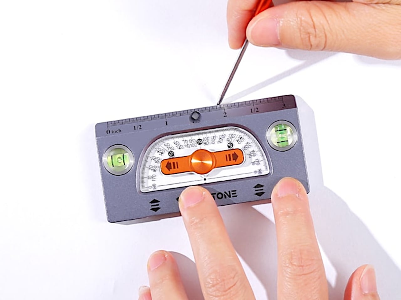 MegaRuler handles angles by letting you draw any-angle slanted lines from 1° to 179° in one smooth motion. The integrated protractor is laser-etched with a high-contrast scale that remains readable in bright light, dust, or glare, so you can lean the body to the exact angle you want and draw without switching tools. For miters, chamfers, or odd-angle joints, it becomes the single reference you reach for instead of juggling a ruler and a protractor and hoping the alignment holds while you mark.