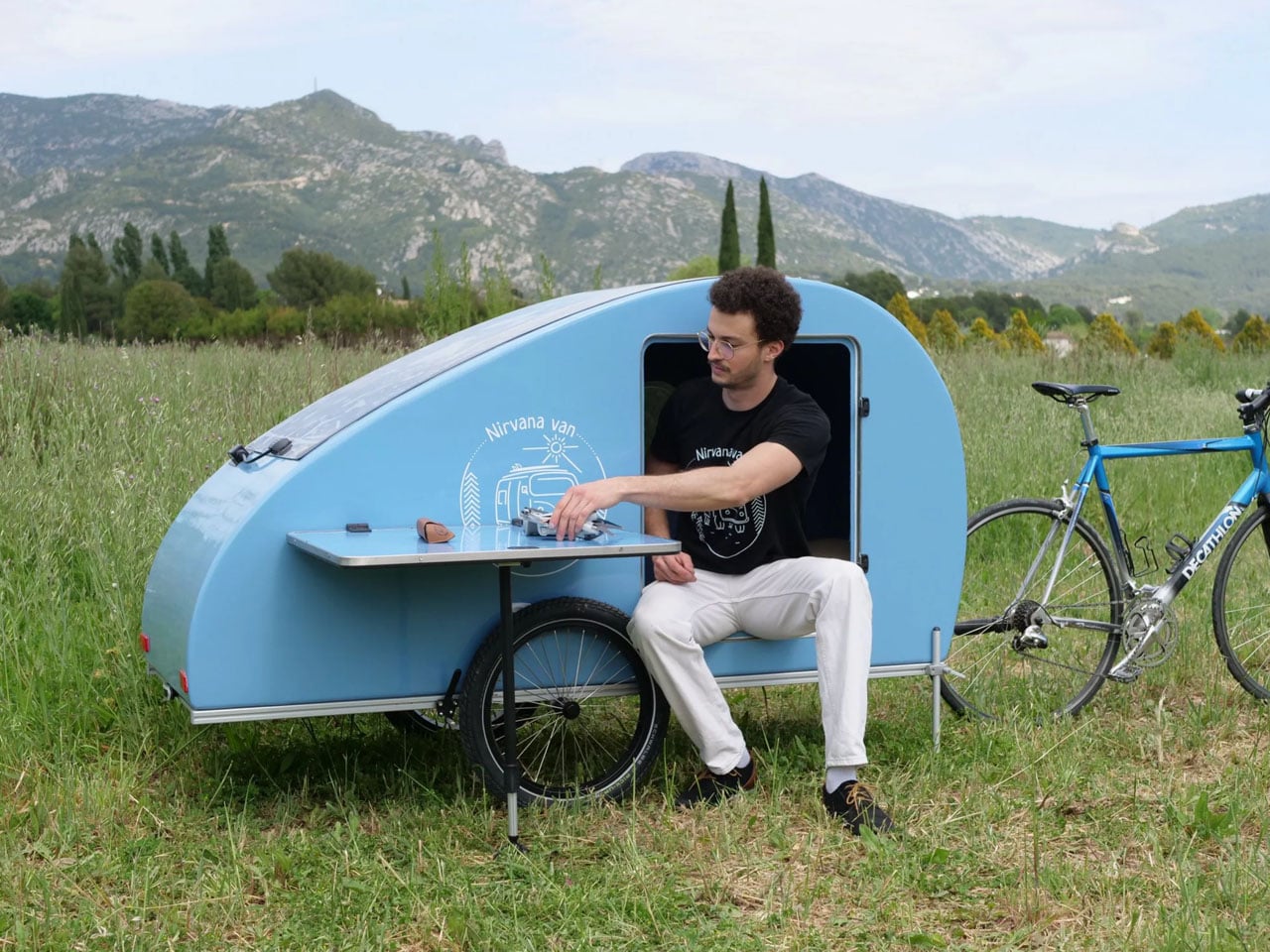 If you remember the SpaceCamperBike, it was an electric bike you can ride, work, sleep, and camp in. The Nirvana Van’s idea of the teardrop trailer is pretty traditional: a trailer to tow behind. The company can customize the trailer hitch to suit a varied choice of electric bikes, making it compatible with whatever brand you own. The bike camper’s efficiency and durability have been put to the test by Raphaël Dakiche of Nirvana Van with over 1200 km journey across France: living out of the trailer riding behind the electric bike.