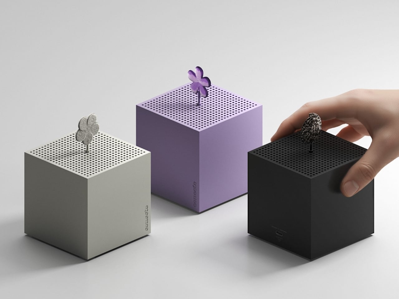 CONECTO offers three signature scents, and each one gets its own symbol inspired by the fragrance’s character. Cotton gets a soft, cloud-like shape. Floral is represented by a delicate flower silhouette. Woody has a circular, organic form reminiscent of tree rings. These aren’t just decorative choices. They’re visual shorthand that connects your sense of smell with something you can see, creating a more complete sensory experience.