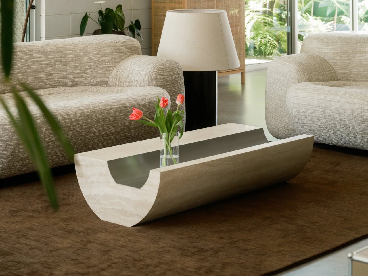 Stone coffee tables often default to simple slabs or blocks, heavy objects that sit on the floor and announce their weight. More interesting pieces treat stone as something to carve and balance, not just to drop into a room. Coffee Table 01 and Side Table 01 by Tom Black lean into that second approach, using one curved gesture to make Italian travertine feel lighter, paired with a contrasting metal inlay that turns solid into void.