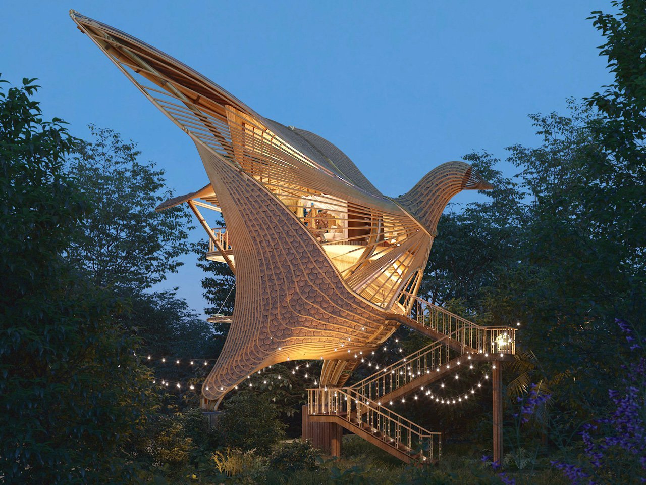 Perched gracefully among forest canopies, “Birdie” by Sri Lankan architect Thilina Liyanage is a bamboo and wood glamping villa shaped like a soaring bird. Elevated on stilts, its winged form appears mid-flight, blending naturally with its surroundings. Designed for a couple or small family, Birdie offers both whimsy and comfort. The villa features a two-story layout—an upper bedroom with a balcony nestled in the bird’s tail, and a lower floor with a living area and bathroom. Warm materials and sweeping curves create a sculptural yet cozy retreat.