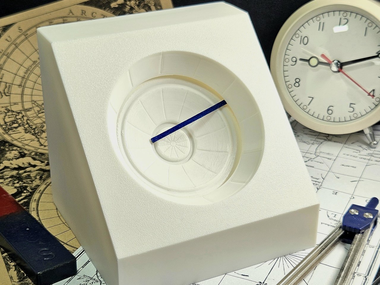 The Trace Line Clock is a minimal, 3D-printed desk clock by Hye-jin Park that uses one continuous hand to show both hours and minutes. The inner end of the line rides an inner circle for the hour, while the outer end rides an outer circle for the minute. As time passes, the line’s angle and length shift, so every glance shows a new geometric relationship between the two.