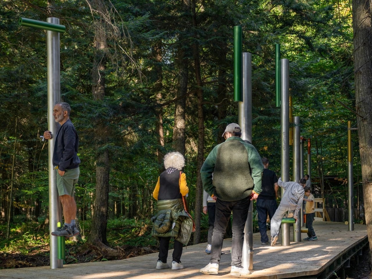 Located at Chouette à voir!, a bird of prey sanctuary in St-Jude, Quebec, this permanent installation transforms a 55-meter elevated boardwalk into an interactive musical journey through the seasons. Ten aluminum perching stations punctuate the path, each one waiting for a human visitor to activate its hidden soundscape. The design is brilliantly simple: step onto a green perch, and you become part of the forest’s symphony.