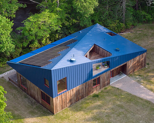WORKac‘s Riverhouse in Hopkinton, Rhode Island, turns floodplain constraints into a defining architectural gesture that merges climate resilience with spatial clarity and formal precision. The project is conceived as a compact, elevated volume defined by a faceted blue metal roof that folds inward to carve out a central courtyard. Conceived to meet Passive House standards, the residence is raised above the ground in response to floodplain conditions. The timber-clad base supports a sharply articulated upper shell, where integrated solar panels and precise openings give the house a clear, almost graphic presence within its wooded setting.